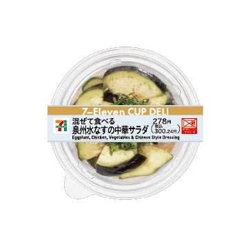 大阪・泉州地域の特産品「泉州水なす」を使ったカップデリ。水分量が多くて皮が柔らかく、アクの少なさとほんのりとした甘みが特長の水なすを、中華風の味付けでサラダにしました。混ぜて食べることで、水なすの食感とさっぱりとした中華ダレの味わいを楽しめる仕立てです。