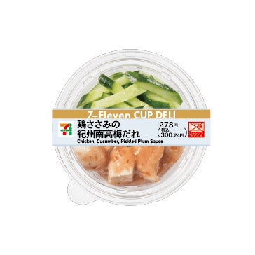 和歌山県産「紀州南高梅」とかつお節を合わせた梅だれを、鶏ささみと一緒に食べるカップデリ。たんぱく質がとれる鶏ささみに、梅だれと相性の良いきゅうりを組み合わせ、さっぱりとした味わいが特長です。