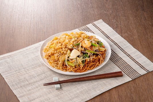 高温短時間で炒めた本格的なチャーハンと、オイスターソースが香る焼きそばを組み合わせた、町中華風のボリュームメニューです。2つの味を一皿でお楽しみいただけます。