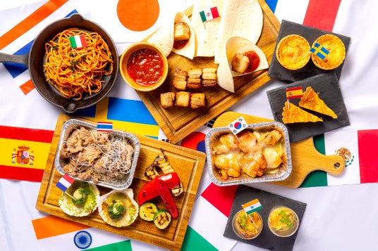 WORLD BBQ - ワールドBBQstyle小海老と帆立貝のマリネ、トロトロ豚バラ肉のトルティーヤ 110g、チーズタッカルビ 100g、牛カルビのタイ風オイスター焼き 125g、殻つき帆立貝のパセリバター焼き 1個、サーモンとほうれん草のスゥエーデン風キッシュ 1個、焼き野菜3種 各1切れ、トマトの焼きパスタ 35g、スペイン産オレンジのタルト 1個