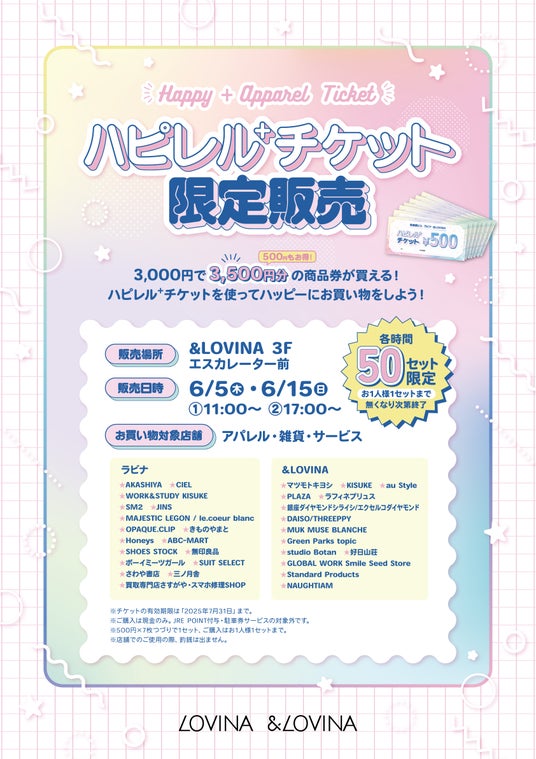 青森駅ビルラビナと&LOVINAでは、アパレル・雑貨・サービスのお店で使えるプレミアム付商品券『ハピレル+チケット』を販売します。3,000円で3,500円分のお得なチケットです。