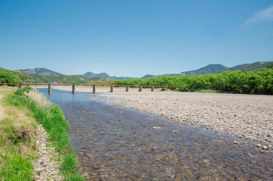 絶景ポイント1 潜水橋透き通った水がさらさらと流れる富田川に掛かる潜水橋。背後に広がる緑の山々を借景に、青い空を写し、太陽の光を受けてキラキラと光る水面が織りなす一幅の絵のような風景に癒されることでしょう。