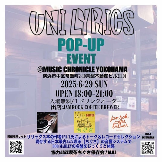 2025年6月29日(日)、『UNI LYRICS POP-UP EVENT』をMUSIC CHRONICLE YOKOHAMAにて開催いたします。本イベントは、横浜を拠点に20年以上活動するレゲエDJ・UNI-T氏によるリリック本『UNI LYRICS』の発刊を記念したものです。
