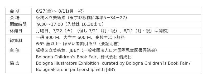 イタリアのボローニャで毎年開催される「ボローニャ国際絵本原画展(Illustrators Exhibition)(※)」の最新の全入選作品を一堂に集めた展覧会を開催します。世界中の多彩なテーマや表現・技法からなる作品をお楽しみいただけます。