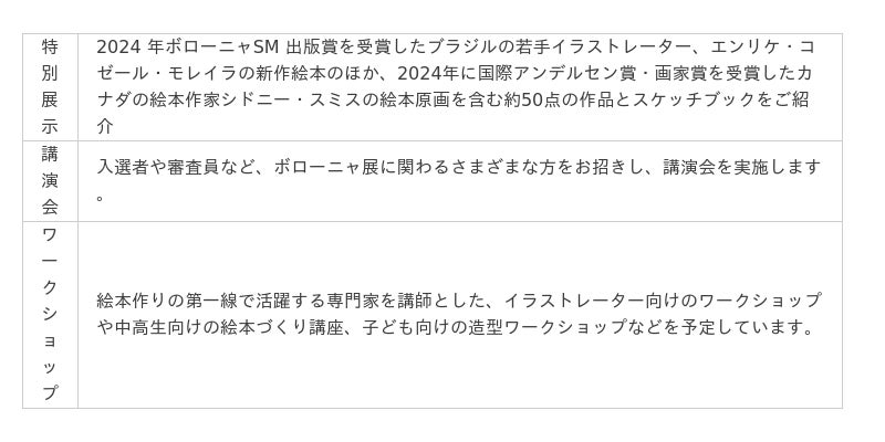 また、特別展示として、2024 年ボローニャSM 出版賞を受賞したブラジルの若手イラストレーター、エンリケ・コゼール・モレイラの新作絵本と、2024 年に国際アンデルセン賞・画家賞を受賞したシドニー・スミスの作品を特別展示としてご紹介します。併せて、会期中には絵本に関する講演会や連続講座、ワークショップなど、幅広い方が絵本文化に触れ合うイベントを開催します。