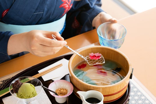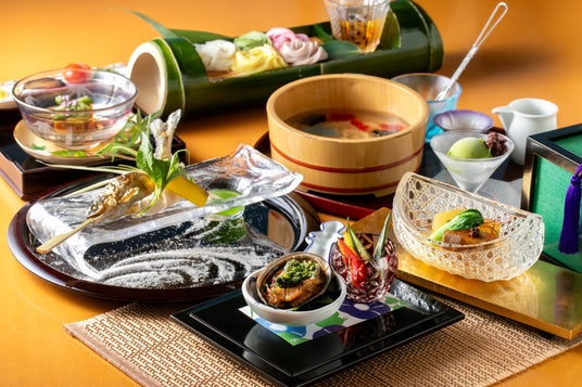 プランの始まりは浴衣の着付けから。約50種類の中からお選びいただいたお好きな色と柄の浴衣を、着付師が着付けいたします。着付けが完了したら、プラン限定の特別会席料理をお召しあがりいただきます。お料理は、涼し気な虫かごのような器に盛られた前菜から始まり、旬の味覚 鮎の塩焼きや色とりどりの五色素麺など夏を存分に感じられるメニューが続きます。コースの最後には、金魚すくい体験ができる特別デザート。水に浮かべた金魚の形のグミとわらび餅をすくってお召しあがりいただき、気分はまるで夏祭り。