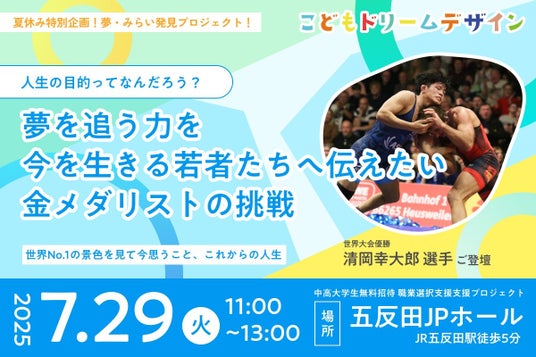 非営利型一般社団法人こどもドリームデザイン(社団所在地:東京都中央区、代表理事:中原美知子)は、2024年男子フリースタイル65kg級の世界大会で優勝金メダルを獲得した清岡幸大郎選手を迎え、主に学生世代へ向けた職業選択支援の一環として「夏休み特別講演イベント」を開催いたします。