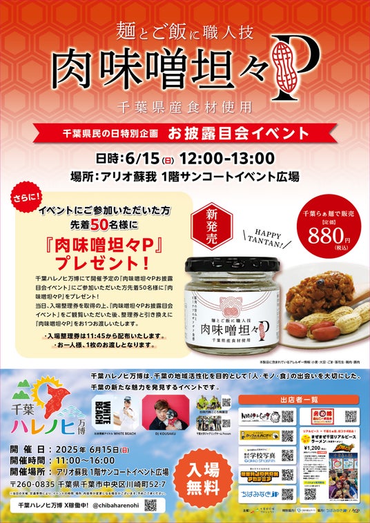 株式会社ワークストア・トウキョウドゥ(本社:東京都大田区、代表取締役:烏川清治)は、千葉県民の日である6月15日(日)に開催される「千葉ハレノヒ万博」内で、こだわりの千葉県産食材をふんだんに使用した「肉味噌坦々P」のお披露目イベントを開催いたします。本イベントは「肉味噌坦々P」の販売促進を目的に、商品の作り手自ら千葉県内外の皆様に「肉味噌坦々P」に込めた想いや商品のこだわりを発表いたします。