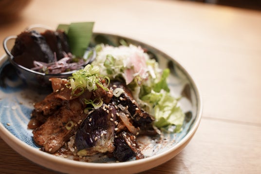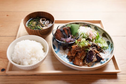 藁焼きカツオと豚と茄子の味噌炒め定食 1,400円(税込み1,540円)香ばしい藁焼きカツオと、旬の茄子、ジューシーな豚肉を特製味噌ダレで炒め、ごはんが進む濃厚な味わいです。