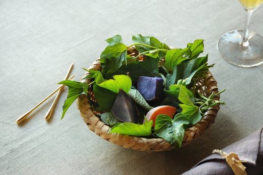 コースのメインは、紅芋の新たな美味しさに出合うアシェットデセールです。表面をキャラメリゼした紅芋は焼き芋のように香ばしく、なめらかな紅芋クリームからはすっきりとした甘さを感じられます。また、添えたラムレーズンアイスの芳醇な香りが、紅芋の味わいに奥行きを与えます。仕上げには、沖縄で日常的に使われる芋の葉「カンダバー(*2)」のチュイルを添え、華やかに彩りました。沖縄ならではの文化を繊細に織り込んだ産地ならではの一皿です。