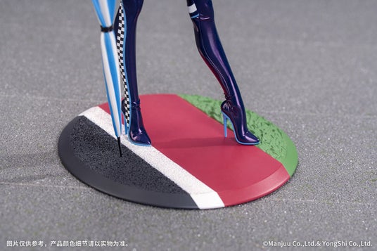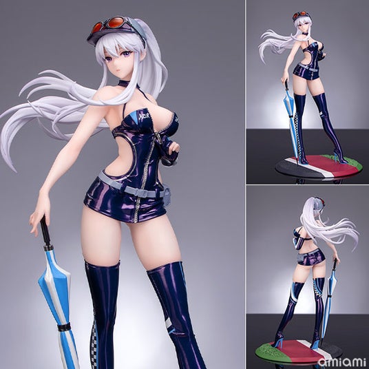 右手に長傘のハンドルを軽く持ち、颯爽とした佇まいでサーキットの脇に立ち、指令を待ち構えるエンタープライズの姿を立体化。銀白のハイポニーテールは風を受けてなびき、その一瞬を切り取ったかのような躍動感を演出している。レースクイーン衣装には上品なパール塗装が施され、金属の質感を再現したジッパーヘッドや、美しい脚線を際立たせるロングブーツも、光沢やシワの表現まで精巧に仕上げられている。