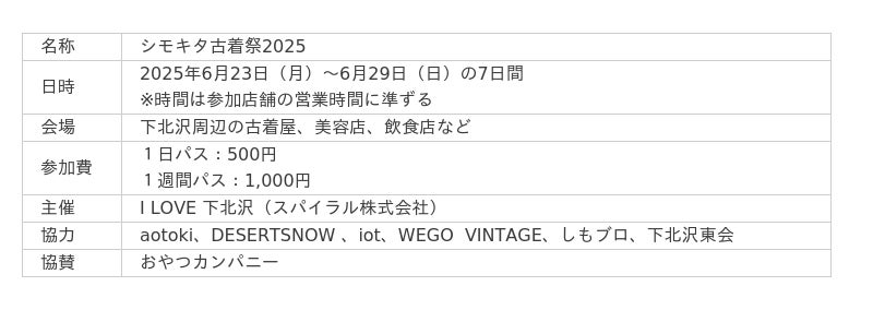 デジタルで未来最適をリードするスパイラル株式会社(東京都港区、代表取締役 CEO 佐谷 宣昭)のまちおこしDXカンパニーは、2025年6月23日(月)から6月29日(日)の7日間、街回遊型のファッションイベント「シモキタ古着祭2025」を開催いたします。このたび、参加店舗とのコラボレーション企画やSNS投稿コンテストなど、イベントをさらに楽しめる最新情報を公開しましたのでお知らせいたします。