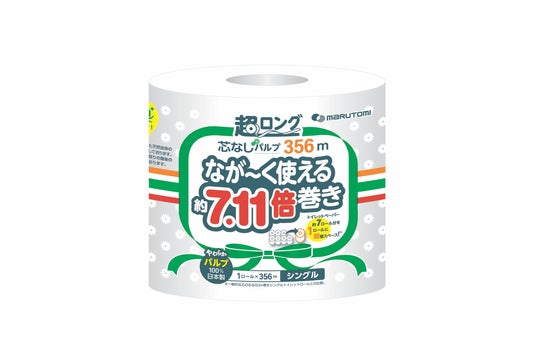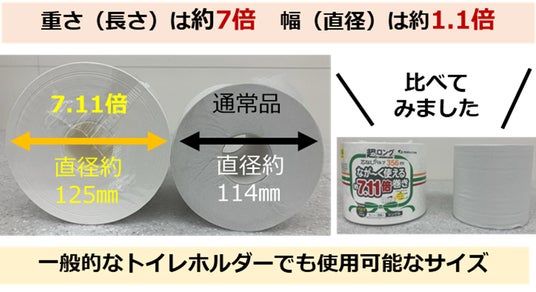 そのような声にお応えし「超ロングトイレットペーパー7.11倍巻シングル 1ロール」が誕生いたしました。多くのトイレットペーパー(シングル)1ロールの長さは50mですが、「超ロングトイレットペーパー約7.11倍巻シングル 1ロール」は356ⅿと通常の約7.11倍の長さを実現しています。200ⅿ以上のトイレットペーパーは丸富製紙株式会社の製法特許(※2)となっており、これまでの日本最長は「超ロングパルプ6倍巻300ⅿ」となっています。