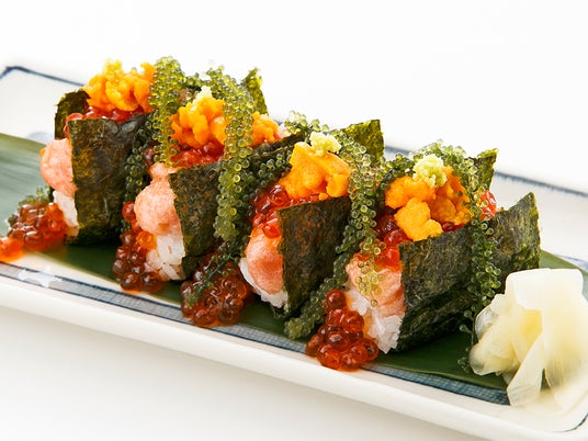 うに・いくらを惜しみなくのせた人気の一品!【ひとくち贅沢こぼれ寿司(海ぶどうのせ)】999円(税込1,099円)