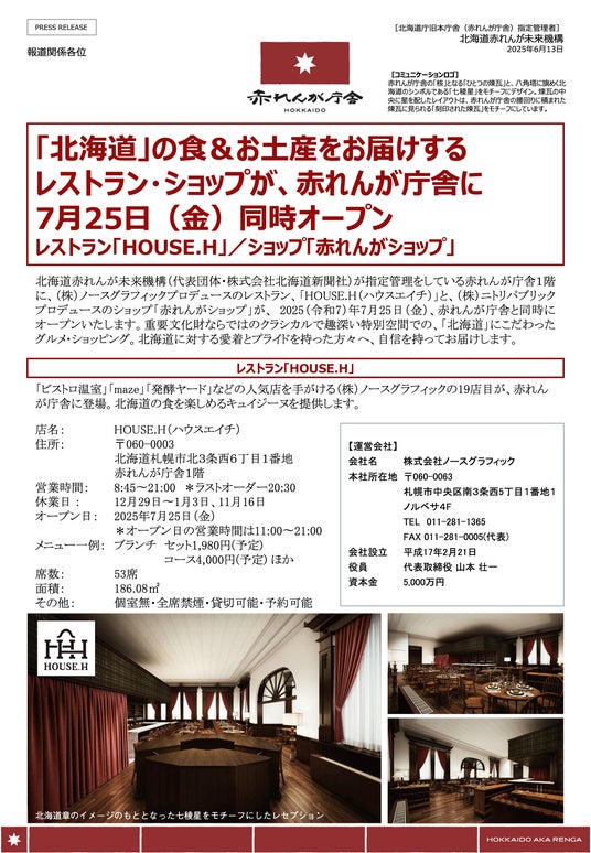 北海道赤れんが未来機構(代表団体・株式会社北海道新聞社)が指定管理をしている赤れんが庁舎1階に、(株)ノースグラフィックプロデュースのレストラン、「HOUSE.H(ハウスエイチ)」と、(株)ニトリパブリックプロデュースのショップ「赤れんがショップ」が、 2025(令和7)年7月25日(金)、赤れんが庁舎と同時にオープンいたします。重要文化財ならではのクラシカルで趣深い特別空間での、「北海道」にこだわったグルメ・ショッピング。北海道に対する愛着とプライドを持った方々へ、自信を持ってお届けします。