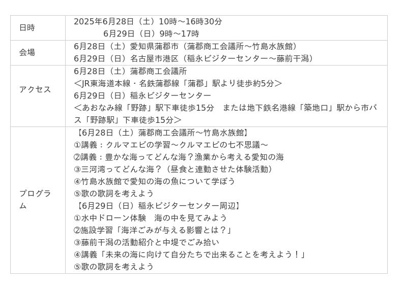 一般社団法人海と日本プロジェクトin愛知県は、6月28日(土) ・6月29日(日)に、愛知県内在住の小学4・5・6年生を対象に愛知県蒲郡市と、名古屋市藤前干潟で愛知の海の豊かさや環境問題について学ぶイベント「クルマエビ救出大作戦in愛知」と「三河湾・伊勢湾防衛大作戦in愛知」を開催します。