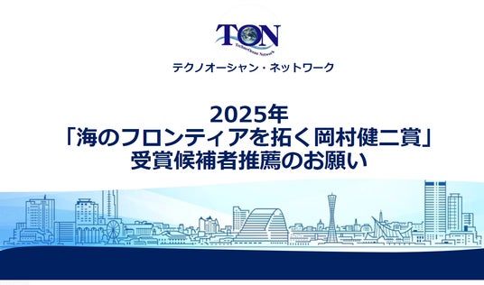 テクノオーシャン・ネットワークでは、2010年に「海のフロンティアを拓く岡村健二賞」を創設し、海洋立国日本の発展に多大なる貢献をされた故岡村健二氏の遺志を継ぐ我が国の海洋工学分野の若い研究者・技術者を表彰しております。つきましては、自薦・他薦を問わず、受賞候補者の積極的な推薦を募ります。受賞者は、選考委員会の厳正な選考を経て決定され、2025年11月27日(木)~29日(土)に神戸で開催される「Techno-Ocean 2025」の会場にて表彰および賞状と副賞(賞金30万円)を贈呈いたします。皆様のご応募お待ち申し上げます。