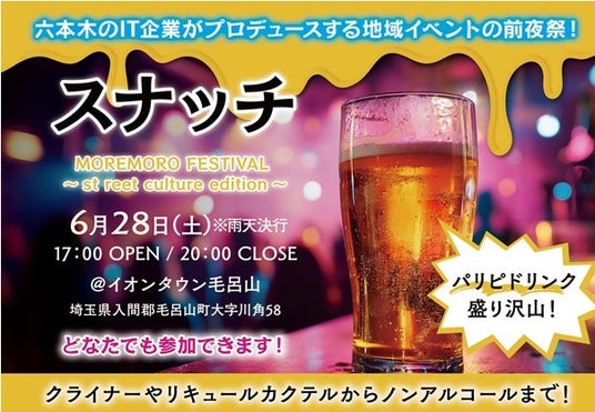 株式会社もろやま創成舎(本社:埼玉県毛呂山町、代表取締役:笠原 喜雄)とTEAMMOREMORO(毛呂山町を起点に活動、代表:松本裕太・吉田武史)は、“子ども達と地域の未来を創造したい”埼玉県毛呂山町発 アーバンスポーツ×音楽イベント「MOREMORO FESTIVAL ~street culture edition~」を、6月29日(日)『イオンタウン毛呂山』にて開催します。