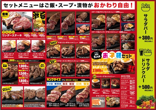 やわらかワンダーステーキ、三日月リブロースステーキ、ハラミステーキ、ロースステーキ、フィレステーキ、赤身カットステーキ、ポークステーキ、チキンステーキなど、本格ステーキを様々な形で楽しんでいただけます。