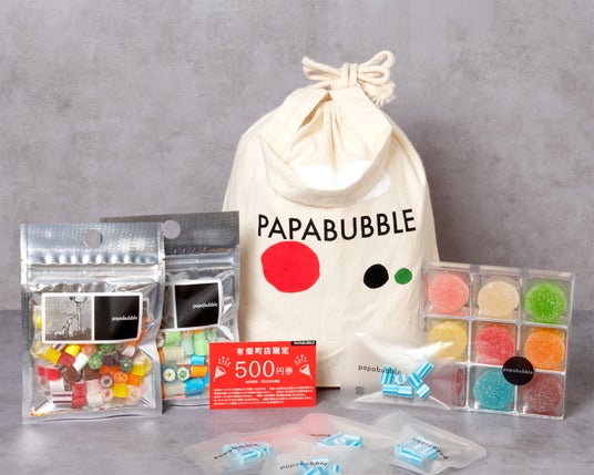 オープン記念として、250袋限定のオリジナル巾着入りキャンディセットを販売いたします。パパブブレ定番の「フルーツミックス」や「サンキューミックス」に加え、限定デザインの「LUMINE STREET」ロゴ入りキャンディもセットにしました。さらに、次回以降のお買い物でご利用いただける500円クーポンも同封された、総額3,980円相当の特別セットです。