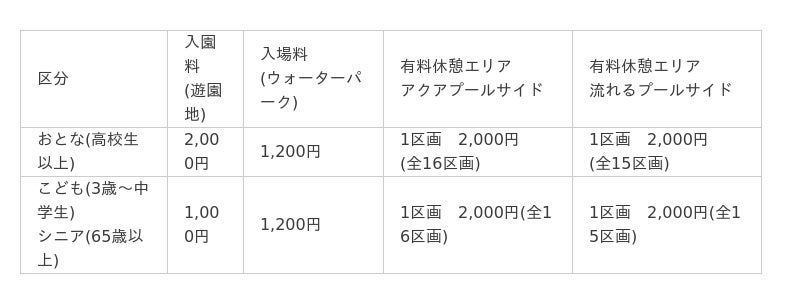 水深0~160cm、未就学児は保護者同伴、プールサイドに有料の休憩エリアあり