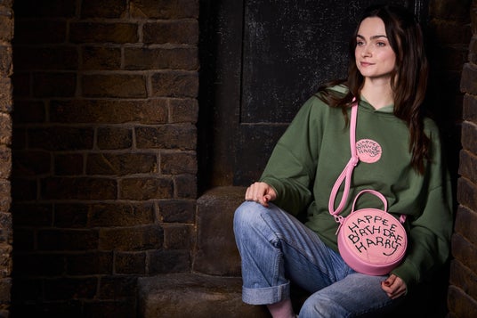 ハリー・ポッター ショップ限定のショルダーバッグ。ピンクとグリーンのスペルミスが入ったアイシングを刺繍で表現し、あのチャーミングで不格好なバースデーケーキを完璧に再現しています。ハグリッドの傘をかたどったジッパーチャームなど、ディテールにまでこだわったこのバッグで誕生日の魔法を持ち歩きましょう!