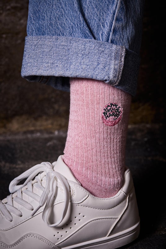 ハグリッドの手作りバースデーケーキにインスパイアされた、ベビーピンクのソックス。忘れられないケーキのデザインと、スペルミスのアイシングがチャーミングな刺繍で表現されています。