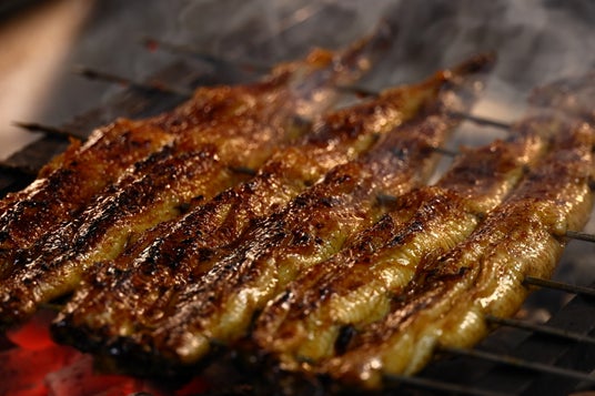 一般的に地焼きは西日本で提供されている腹開きした鰻を蒸さずに仕上げますが、梅鉢 では、江戸前の背開きした鰻をご提供いたします。背開きで地焼きすることで脂を落としすぎない効果があり、店内で割いた新鮮な鰻を炭火で焼き上げます。