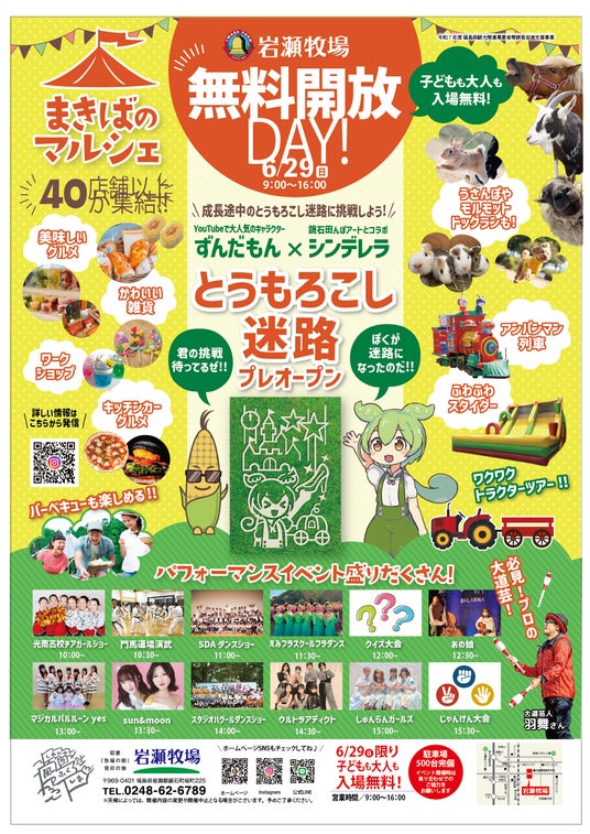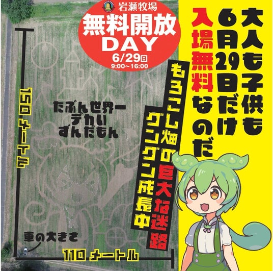 岩瀬牧場では、例年夏に「とうもろこし巨大迷路」を行っており、本年度、YouTube やニコニコ動画などでも大人気のキャラクター「東北ずんだもん」とコラボを行い、キャラクターの地上絵になるという新たな取り組みを始めます。そこで成長途中の迷路を見てもらおうと、プレDC の期間である6月29日(日)に、牧場の入場料やとうもろこし迷路の参加料を無料にするほか、「まきばのマルシェ」と題し、グルメや雑貨など、40 店舗以上が集まり、クイズや大道芸、ダンスに音楽といった多彩なステージパフォーマンスもあり、盛りだくさんの内容となっております。
