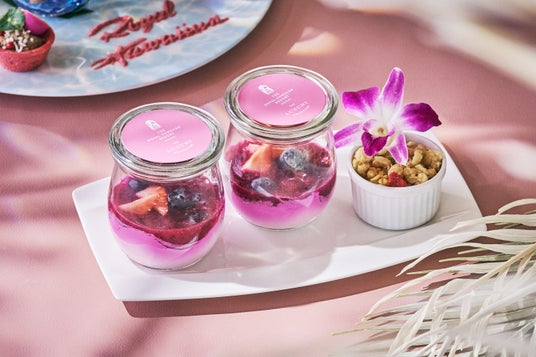 “Aloha Pink”をテーマにピンクパレスの世界観をスイーツプレートに、ロイヤルハワイアンの目の前に広がる海のブルーをセイボリープレートに表現したアフタヌーンティー。スイーツは、現地のレシピで作る人気のハウピアケーキを囲むようにロイヤルハワイアン バナナブレッドなどを並べ、セイボリーには、ドラゴンフルーツと和えたサーモンと美しいブルーのジュレやスパムサンドをご用意。グラノーラを加えながら味わうピンクピタヤボウルと共にお楽しみいただけます。