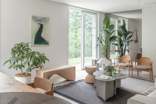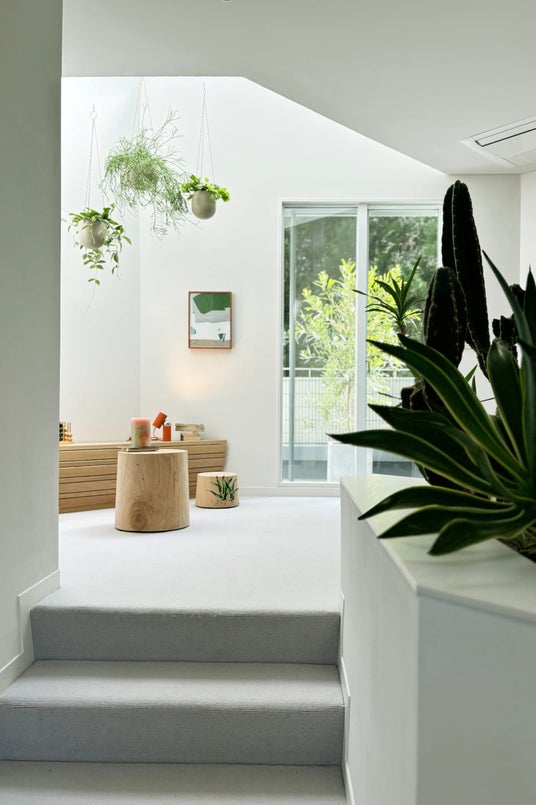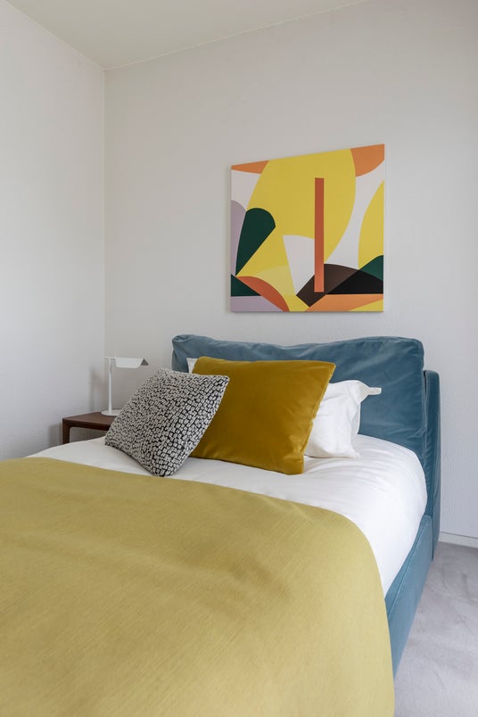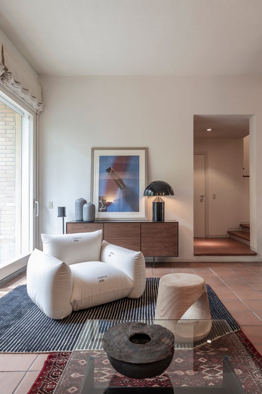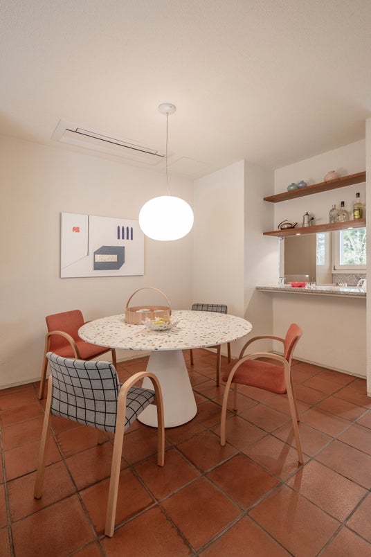 B棟〈POP〉室内は、元の間取りを変えることなく、家具と小物の入れ替えのみで暮らしをアップデート。自然光が心地よいラウンジスペースは、軽食をとったり本を眺めたりして過ごせます。ダイニングはテラッツォのテーブルに張り地ちがいのチェアを合わせた、どこかノスタルジックな空間。2Fには、家具とアートの色彩が調和したインテリアが魅力の、ゲスト用の宿泊部屋も用意。