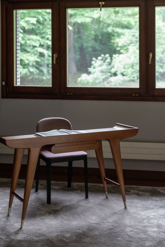 広々とした主寝室にある書斎スペース。手工芸品のような趣のデスクが窓面に対して斜めに配され、窓越しの緑とあいまって詩的な風景を生み出します。
