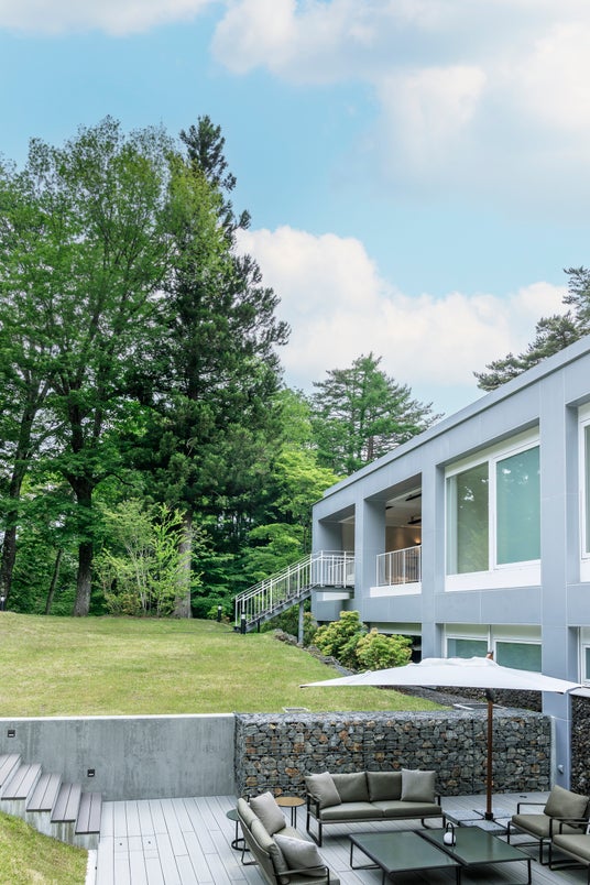 本来の森のありように近づけるための植樹を行い、自然と建築が呼応し合うランドスケープデザインが広がるカーサミア河口湖。このたびのリニューアルでは、かつてテニスコートがあった場所にガーデンが新たに誕生しました。サテライト棟の1Fに面したテラスでは、Molteni&Cのアウトドア家具が配され、空を見上げながらゆったりとくつろぐひとときを過ごせます。2Fのテラスから階段を降りてガーデンへ出ることもでき、屋内外を自由に行き来しながら、自然とともに過ごす豊かな時間を楽しめます。