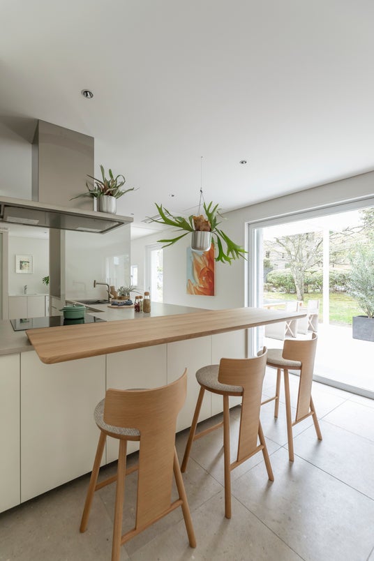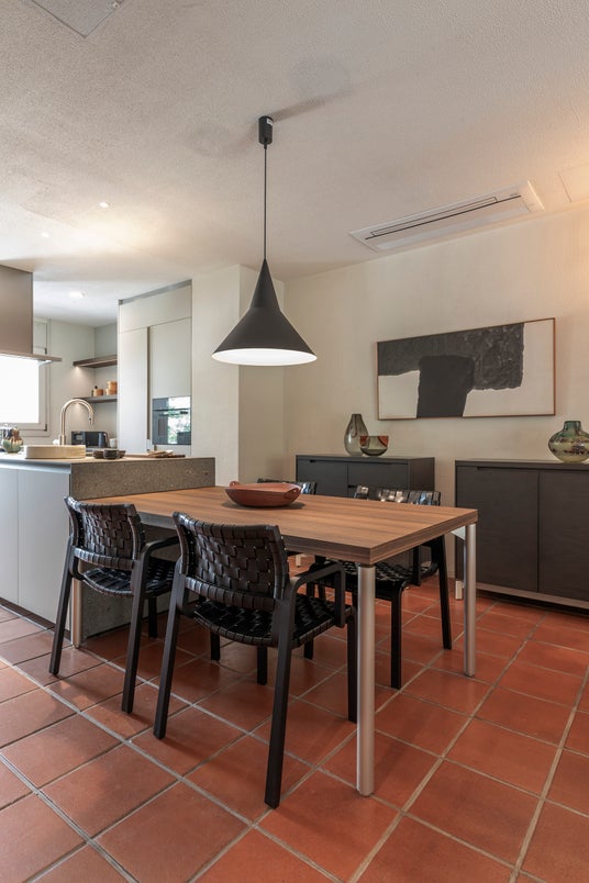 A棟〈CHIC〉の室内は、古い民芸品やモダンアート、世界各国のエッセンスを取り入れたミックススタイル。キッチンリフォームを実施し、家族が一緒に料理を作り、食事を楽しみ、片付けまでをスムーズに行える一体型のダイニングキッチンが魅力。使い込むほど愛着の湧くキッチンには、経年変化を味わえるレザー編みのチェアをセレクト。