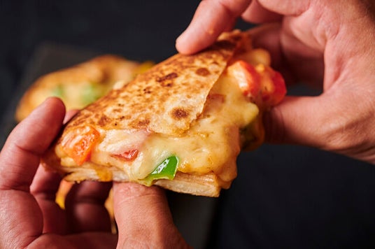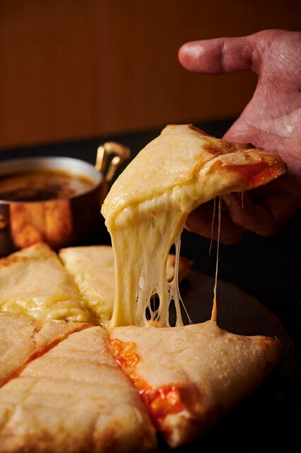 当店のポケットピザは、パラーター※1で作り上げており、中身はたっぷりのチーズ※2と、野菜※3・鶏のもも肉です。
