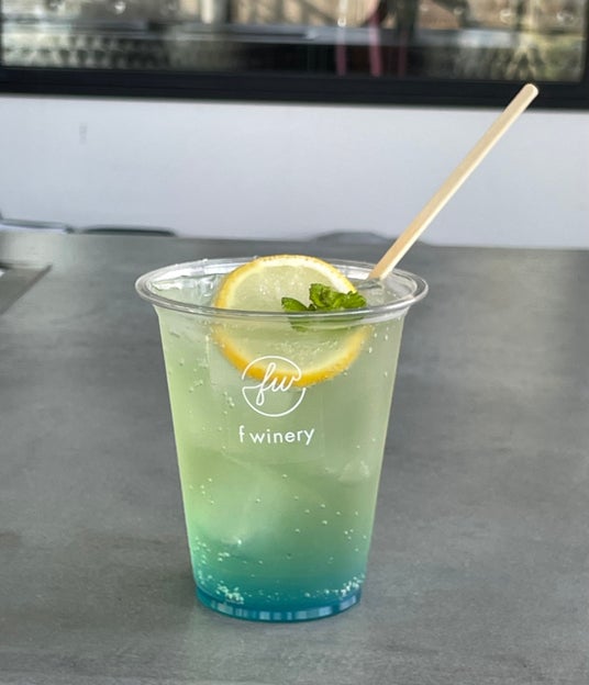 ・Blue : 神戸の海の白ワインカクテル〈f winery白ワイン・ブルーキュラソー・パイナップルシロップ・ジンジャーエール・スライスレモン・ミント〉