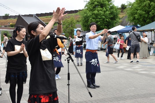 みしまコロッケ音頭!の音楽に合わせて踊る市民と観光客