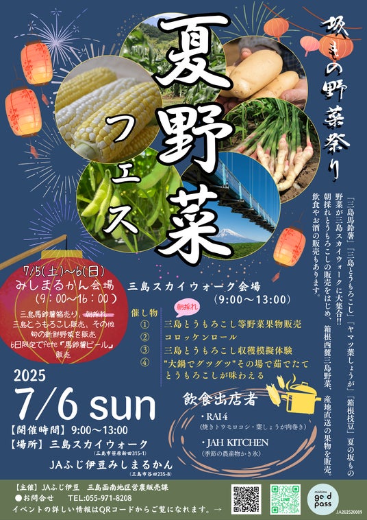 JAふじ伊豆らが主催、箱根西麓の夏野菜を集めた、坂もの野菜祭り 「夏野菜フェス」を2025年7月6日(日)メイン会場「三島スカイウォーク」サブ会場「JAファーマーズマーケットみしまるかん」で開催します。