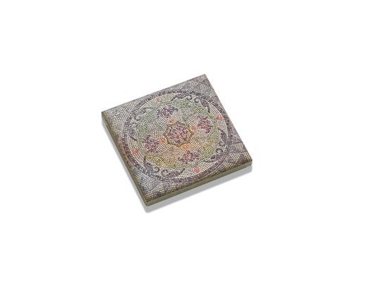 東京都庭園美術館のシンボルである正面玄関のガラスレリーフ扉の前には、小さな大理石がモザイク状に配されています。自然石の細かなピースが織りなす幾何学模様のフレームを1本1本丁寧に描き出し、時間帯や天候によって変化する深みのある色合いと、天然石ならではの表情豊かな質感を、実物に近い形で再現しました。永遠の一瞬をとらえたかのような、神秘的な作品と出会ったときの感動を、指先からそっと呼び覚ますアイテムです。