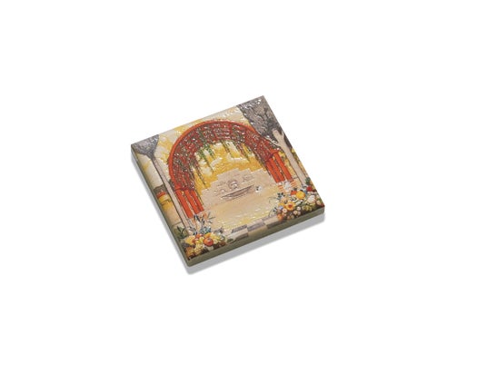 来客時の会食に使われていた大食堂の暖炉の上には、赤いつる棚や泉が鮮やかな色彩で描かれた壁画があります。実物に近い壁の質感を忠実に再現し、庭園を望む部屋の空気感をそのままマグネットの中に閉じ込めました。後景にはなだらかな質感を加え、手前のモチーフには高さをつけることで、壁の奥に広がる絵の奥行きを表現しています。時代を超えてタイムスリップするような、不思議な感覚を味わえるアイテムです。