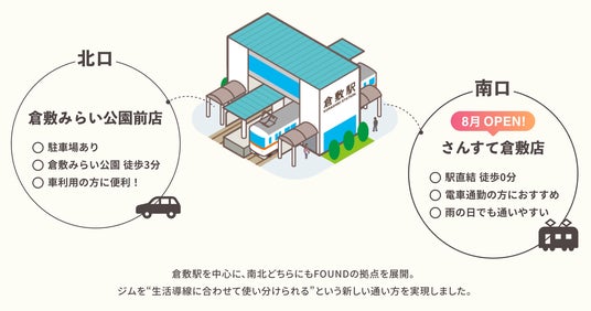 倉敷駅北口に店舗を構えるFOUNDが、南口に駅直結の新店舗をOPENします。北口側は倉敷みらい公園店、南口側はさんすて倉敷店と、南北両方に店舗があるエリア唯一のパーソナルジムとなりジムへの通いやすさをさらに加速させます。
