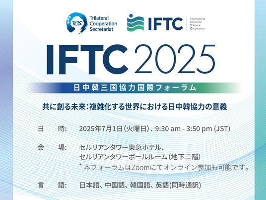日中韓三国協力事務局(TCS)は、2025年7月1日(火)に、東京・セルリアンタワー東急ホテルにて、「日中韓三国協力国際フォーラム2025(International Forum for Trilateral Cooperation, IFTC2025)」を開催いたします。