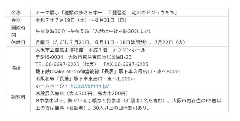 大阪市立自然史博物館では、令和7年7月19日(土)から8月31日(日)まで、テーマ展示「種類の多さ日本一!?琵琶湖・淀川のドジョウたち」を開催します。