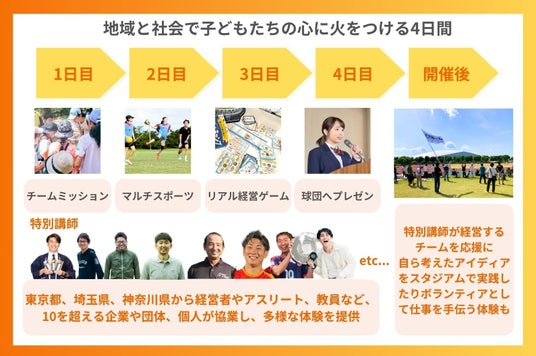 このキャンプは、子どもだけでなく、保護者・企業・自治体・スポーツチームにとっても価値のある仕組みです。子ども30人に対して、講師やスタッフは20人以上。経営者やスポーツ選手が特別講師を務めるほか、プログラムは早稲田大学出身の教育者と共同開発しています。講師・スタッフの出身校は、東京大学・京都大学・一橋大学・筑波大学・都立大学・早稲田大学・慶應義塾大学・上智大学・青山学院大学など、努力と志を体現した方々です。職業もまた、Jリーグを目指すクラブの経営者、大手企業やベンチャー、伝統企業の経営者、協会理事、NPO代表、熊谷市役所職員、カメラマン、教員など、多様な現場から集結しています。一人ひとりに声をかけ、子どもたちの未来のためにと、理念に共感し、快く参画を引き受けてくださいました。