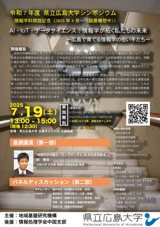 県立広島大学(学長:森永 力、広島市南区)では、この度、令和8年4月からの情報学科(設置構想中)開設に向け、同学科が目指すべき人材育成のあり方について議論する場を設けるべく、令和7年7月19日(土)にシンポジウムを開催します。