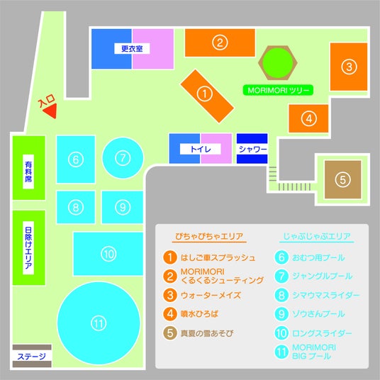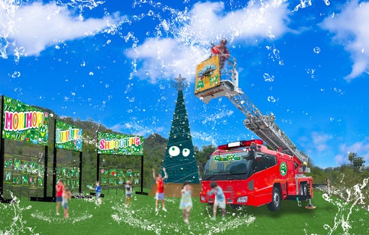 「びちゃびちゃエリア」は、真っ赤なはしご車、パネルがクルクル回る水鉄砲シューティングゲーム、雪遊び広場など体験型コンテンツが揃うエリアで、目玉となるのは「びっちゃんこタイム」です。毎時00分に、パトランプとサイレンの合図とともに、はしご車から放水が行われ、思い切りびしょぬれになって楽しむことができます。さらに土日・祝日およびお盆期間中は、「スプラッシュマン」が高さ約10mに伸びたはしごからゲストに水をかける特別イベント「スーパーびっちゃんこタイム」も開催します。一方、「じゃぶじゃぶエリア」にはシンボルキャラクター「MORI MORI兄弟」をモチーフにした高さ6mの巨大バルーンプールや、長さ15mの3連ロングスライダーなど個性豊かな6種のプールが揃います。
