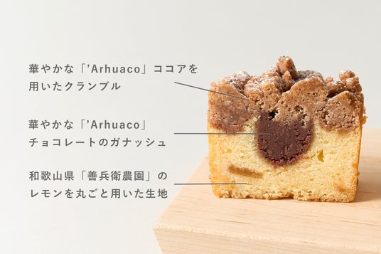 中心には、レモンの爽やかさと調和する、華やかなカカオの風味が特長の「’Arhuaco(アルアコ)」チョコレートを使用したガナッシュをしのばせました。トップには、「’Arhuaco」のココアを加えたクランブルをトッピング。軽やかさの中に満足感のある、奥行きある味わいに仕上げています。
