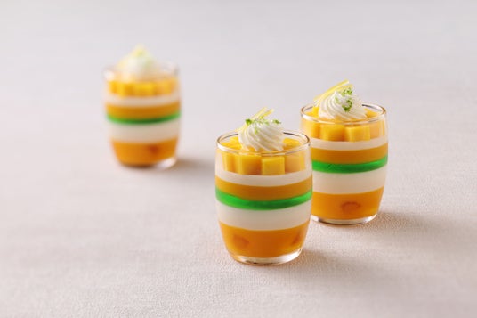 ◆ヴェリーヌトロピカルマンゴーとアプリコットのゼリーに、バナナのパンナコッタとライムゼリーを順に重ねた、トロピカルカラーのコントラストが美しいグラスデザートです。中にはカクテルフルーツのパート・ド・フリュイを忍ばせ、食感にアクセントを加えました。