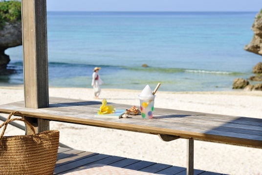 バンタカフェは、崖の上から浜辺へと続く国内最大級の海カフェです。サンゴ礁が広がる海を臨み、白砂のビーチに降りれば、波に打ち上げられたサンゴのかけらにヤドカリの姿もあり、のんびり磯遊びもおすすめです。海に近い「海辺のテラス」ではドリンクを楽しみながら、磯遊びする姿を見守ることができ、磯遊びの後に嬉しい足洗い場も備えています。