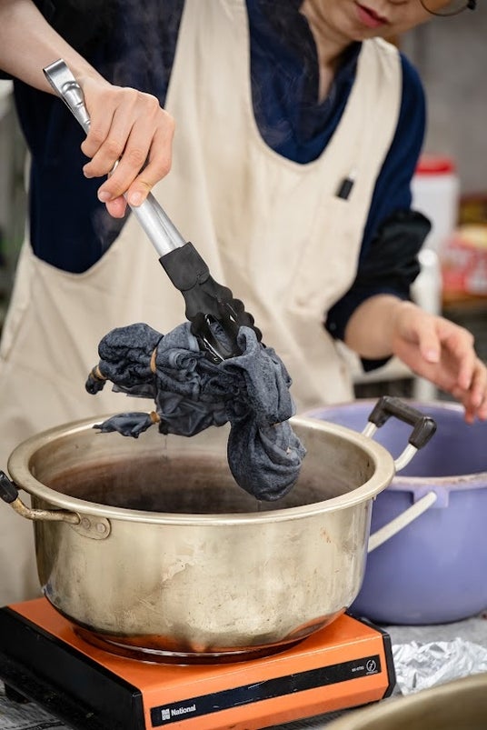 かまどにかけた大鍋のなかで布を回しながら染める伝統的な作業を60年以上続けている。新宿区染色協議会の若手技術者に技術指導にあたるほか、絞り染めの体験会を実施するなど、周知と地域に貢献している。